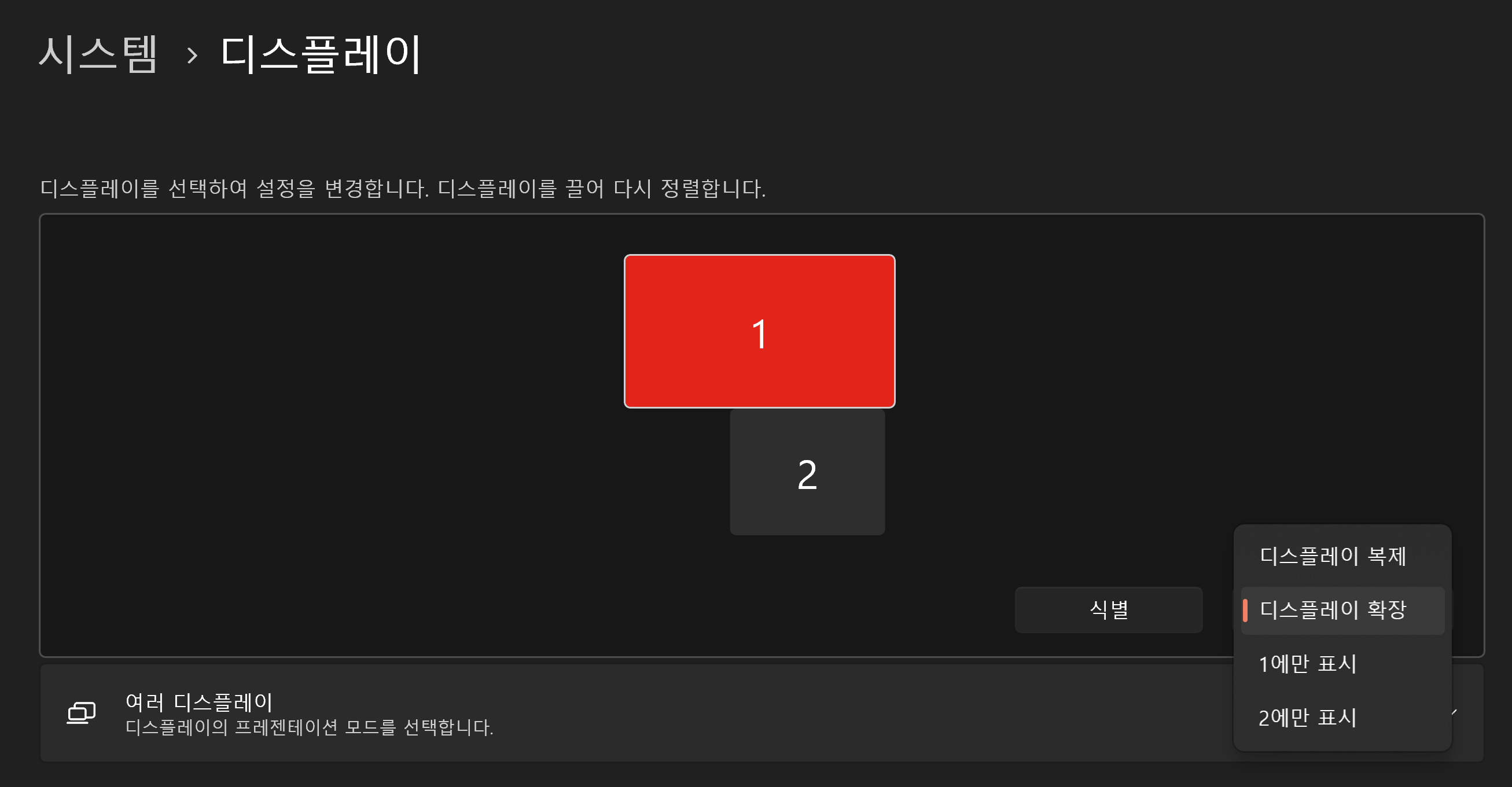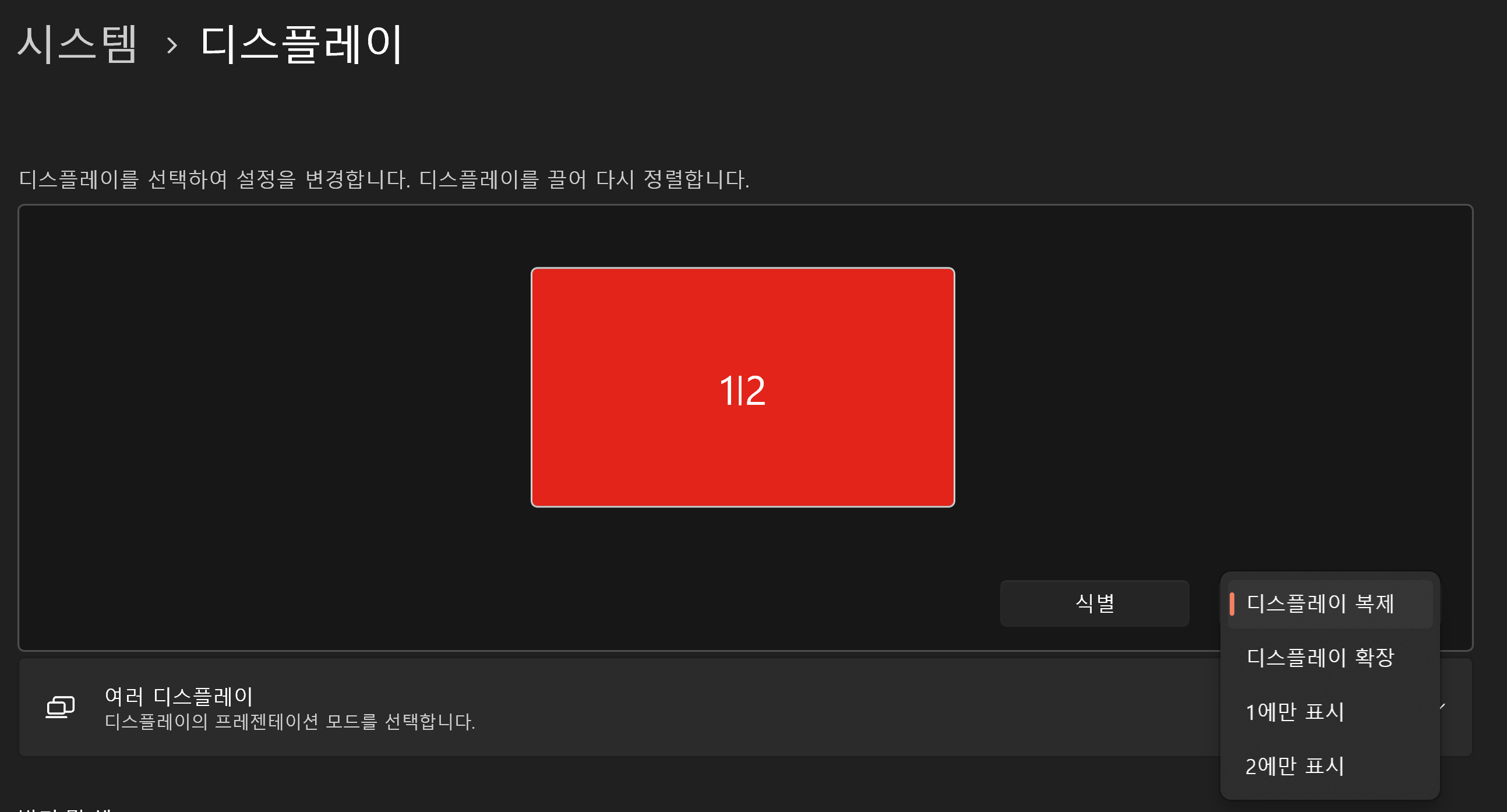 디스플레이 설정에 진입하여 기존 '디스플레이 복제'로 되어있던 옵션값을 '디스플레이 확장'으로 변경해 줍니다.