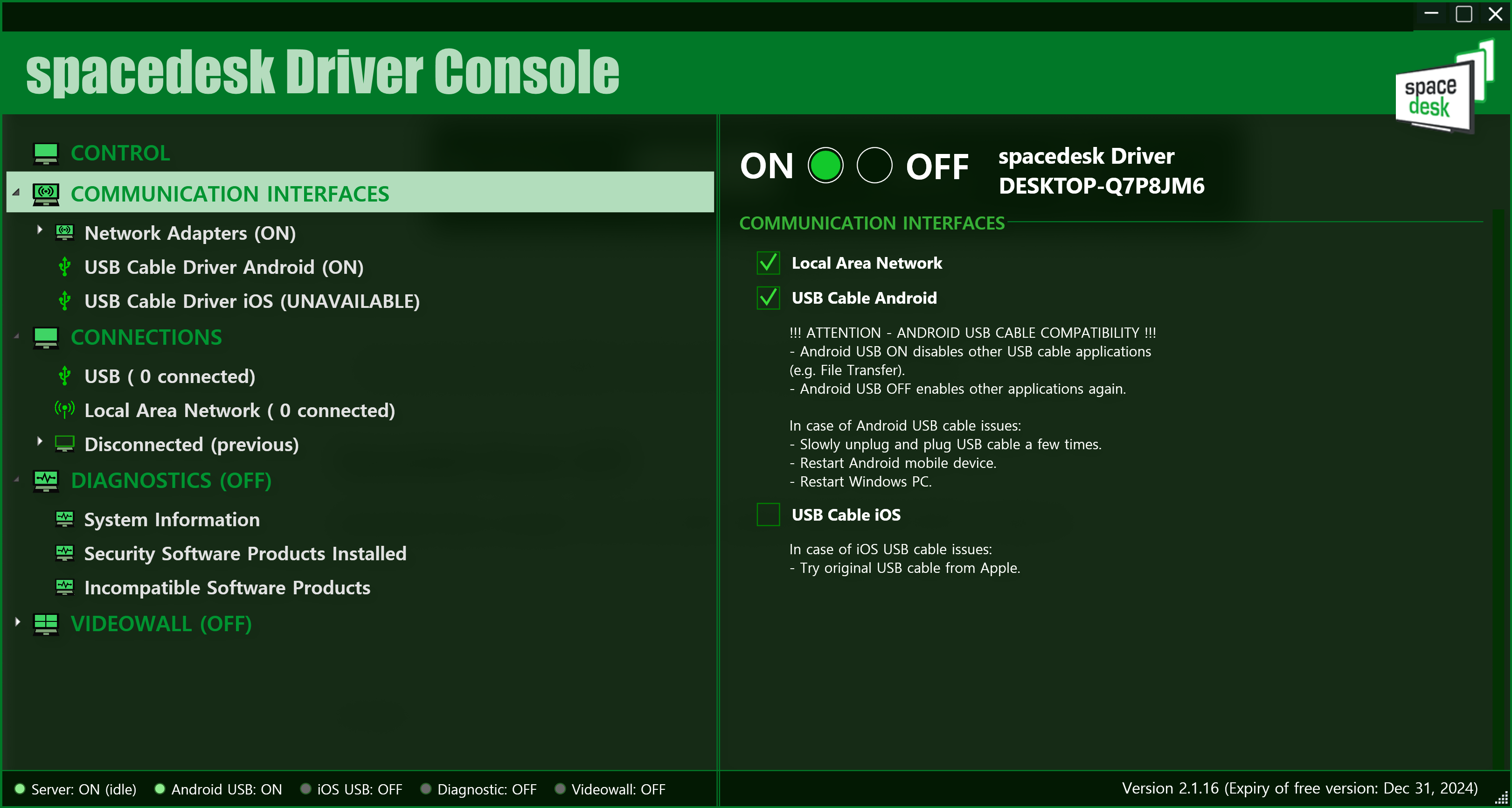 spacedesk driver console 프로그램을 실행하면 아래와 같은 화면이 표시됩니다.