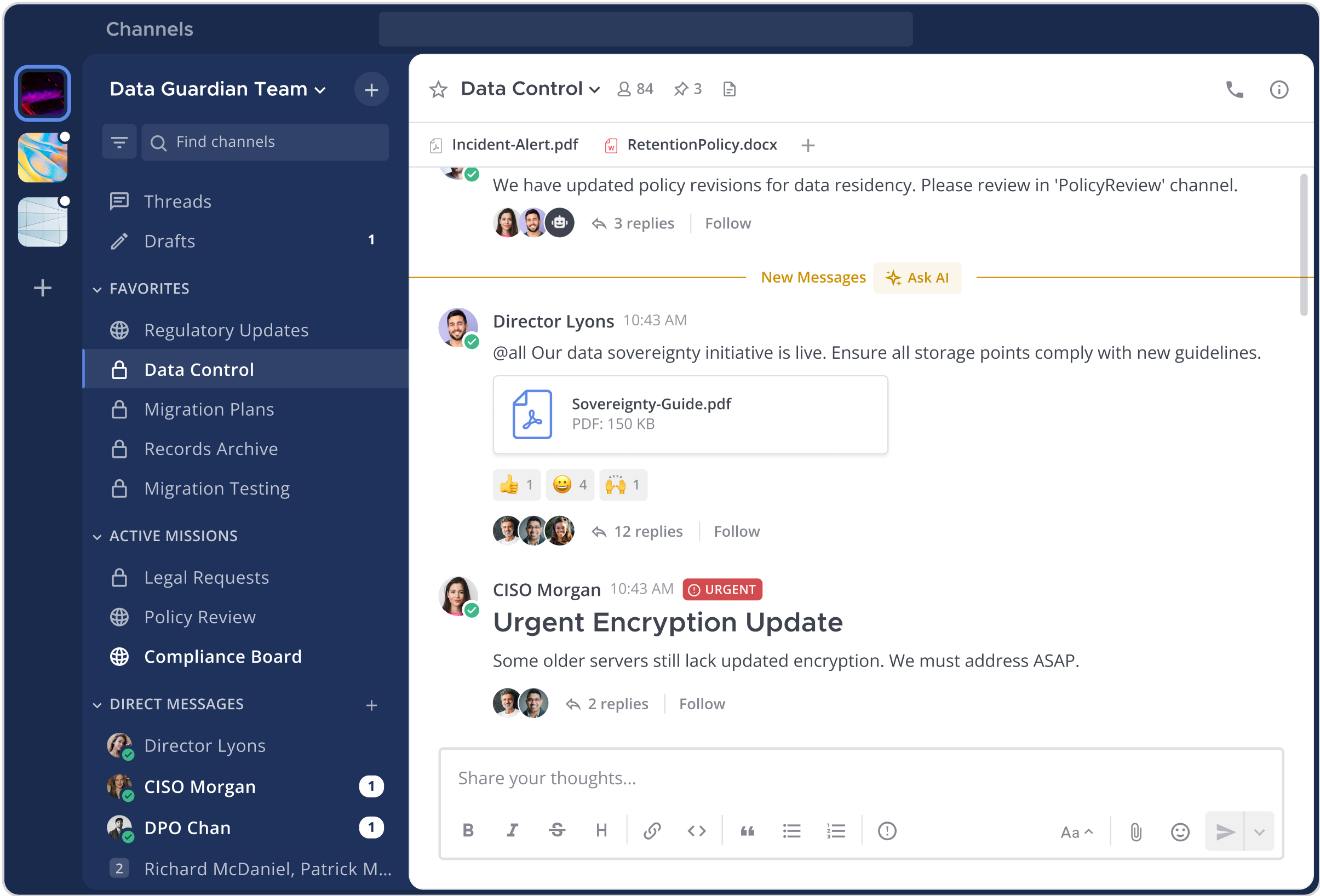 각 프로젝트, 기능, 버그 추적 등에 대한 전용 채널을 만들어 관련 내용을 한 곳에 집중시키고, 외부 정보 유출 없이 민감한 내용을 논의할 수 있습니다.